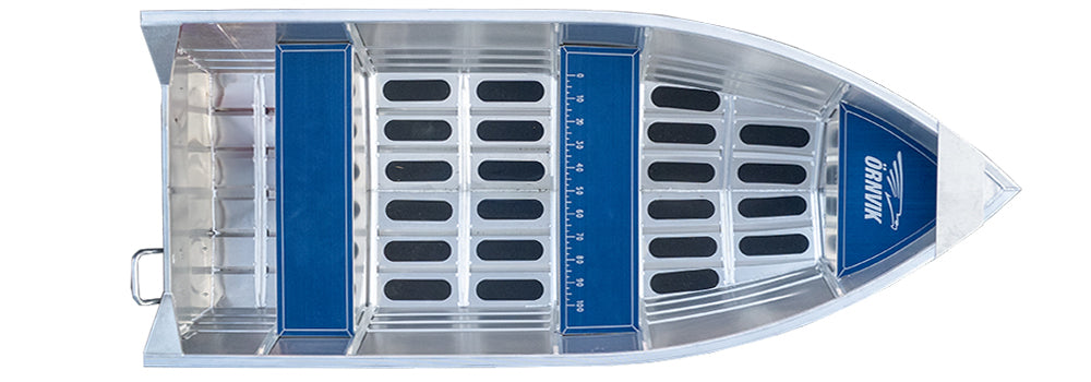 Invändigt är båten utrustad med ett halkskydd längs hela durken. Bänkarna är försedda med mjuk mörkblå EVA-softteak med integrerat måttband på mellersta bänken för att enkelt kunna mäta sin storfångst.