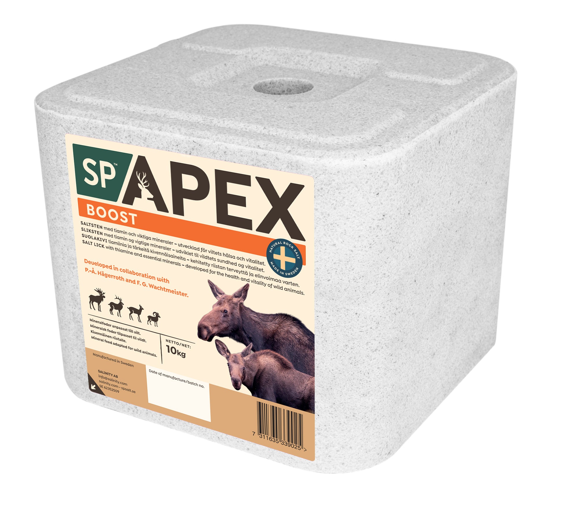 SP Apex Boost är en saltsten tillverkad i Sverige av naturligt stensalt och framtagen för att stödja djurens allmänna välmående under perioder med högt näringsbehov. Den innehåller utvalda mineraler och vitaminer som bidrar till ett starkt immunförsvar, god muskel- och benhälsa samt ökad motståndskraft. SP Apex Boost är särskilt lämplig att placera ut i skogen för att ge klövvilt och annat vilt ett viktigt näringstillskott året runt, med extra fördel under vår och höst då behovet är som störst.